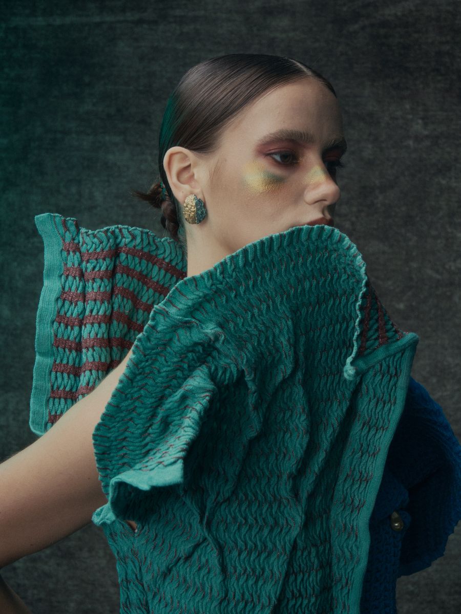 另外一位段淇淇 Annie 的作品《青銅回聲》從三星堆青銅文化汲取靈感,以CONSINEE“Jupiter”及 ICCI “Odell”紗線重現(xiàn)古老紋理與現(xiàn)代輪廓的對話,獲得「三黃集團青年才藝獎」及「最佳澳大利亞美利奴羊毛應(yīng)用獎」。